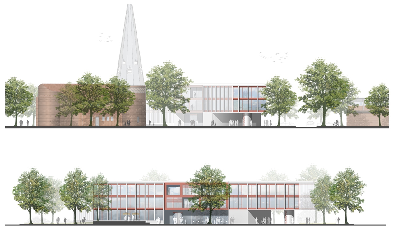 Dieser respektvolle Abstand sichert die uneingeschränkte Freistellung / Solitärstellung der Kirche, artikuliert den gemeinsamen Kirchplatz, sowie unterschiedlich gewichtete Vorplätze und Zugänge.